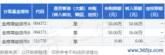 注:(1)上表所称申购含定期定额投资。(2)本基金场内份额(E类基金份额)简称“金鹰现金增益E”,场外份额(A、B类基金份额),简称金鹰现金增益A和金鹰现金增益B。(3)根据国务院办公厅关于2025年部分节假日安排的通知及沪深证券交易所休市安排,2025年5月1日(星期四)至2025年5月5日(星期一)休市,2025年5月6日(星期二)起照常开市。根据法律法规和基金合同的相关规定,本基金管理人决定从2025年4月24日起金鹰现金增益E暂停申购业务。在金鹰现金增益E暂停申购业务期间,金鹰现金增益E的赎回、二级市场交易等业务仍正常办理。从2025年4月29日起金鹰现金增益A和金鹰现金增益B暂停在代销机构单日单个基金账户累计超过50万元(不含)的申购、定投以及涉及本基金作为转入方的基金转换转入业务,暂停在直销机构单日单个基金账户累计超过50万元(不含)的涉及本基金作为转入方的基金转换转入业务。即如单日单个基金账户累计申购(含转换转入及定投)基金份额的金额超过上述限额要求,本基金管理人有权全部或部分拒绝该类份额申请。(4)从2025年5月6日起金鹰现金增益E恢复正常申购业务。从2025年5月6日起金鹰现金增益A和金鹰现金增益B恢复原有申购(含转换转入及定投)投资大额限额,在代销机构个人客户单日单个基金账户累计申购(含转换转入及定投)基金份额的最高金额为1000万元(含),在代销机构非个人客户单日单个基金账户累计申购(含转换转入及定投)基金份额的最高金额为100万元(含),在直销机构单日单个基金账户累计申购(含转换转入及定投)基金份额的最高金额为1000万元(含)。即如单日单个基金账户累计申购(含转换转入及定投)基金份额的金额超过上述限额要求,本基金管理人有权全部或部分拒绝该类份额申请。如取消该限制大额申购条款,将另行公告通知。