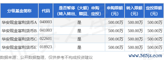 本站消息同花配,4月23日华安基金管理有限公司发布《关于华安现金富利投资基金暂停大额申购、大额转换转入及大额定期定额投资的公告》。公告中提示,为保护本基金现有基金份额持有人的利益,本基金管理人决定自2025年4月24日起暂停华安现金富利投资基金的大额申购、大额转换转入及大额定期定额投资业务,自2025年4月24日起华安现金富利投资基金暂停大额申购、大额转换转入及大额定期定额投资,申购、转换转入上限金额为500.0万元,下属分级基金调整明细如下: